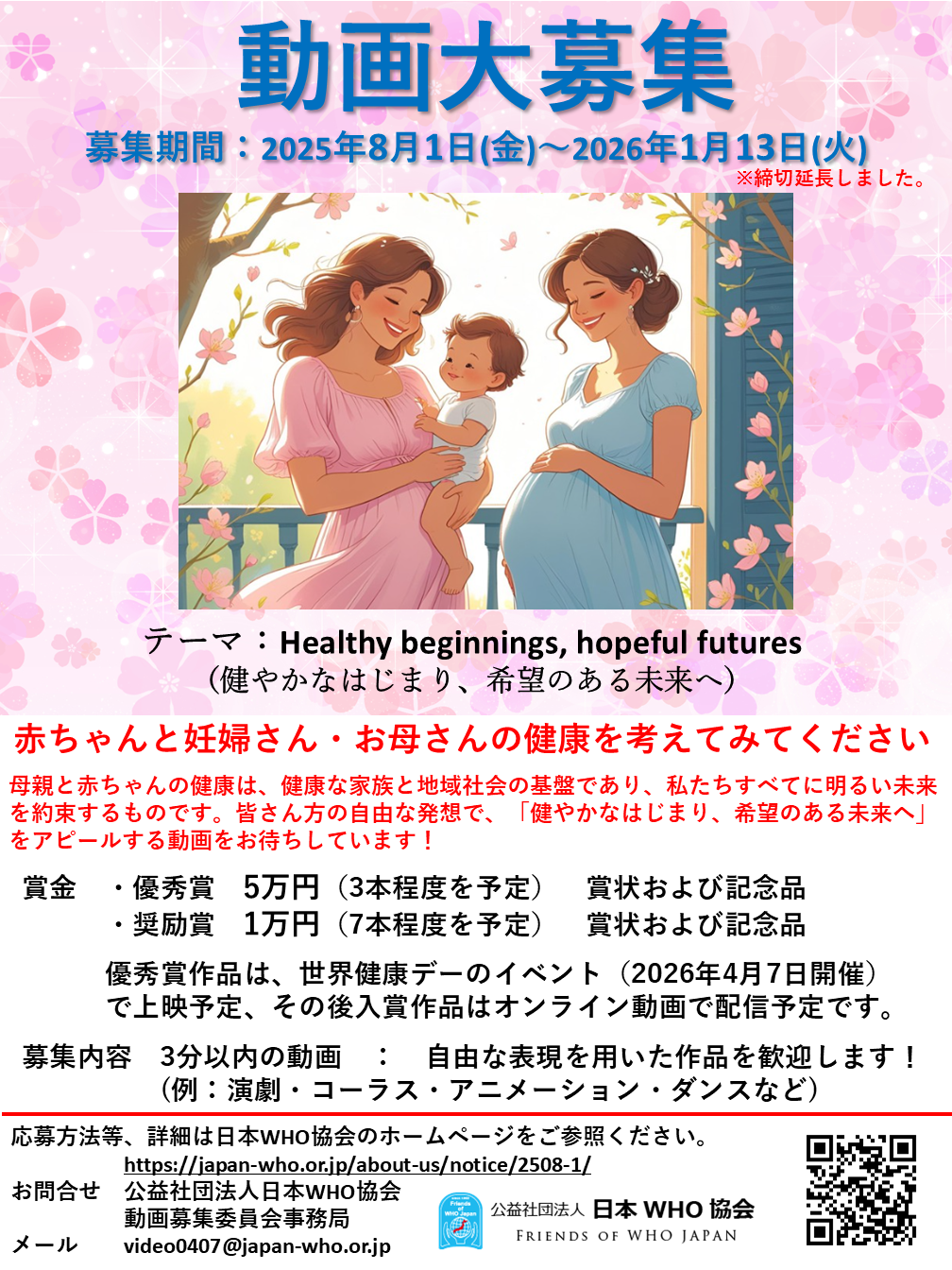 日本 WHO 協会は WHO 世界健康デー 2025 のテーマ「Healthy beginnings, hopeful futures (健やかなはじまり、希望のある未来へ) 」に沿った動画作品を募集します。
