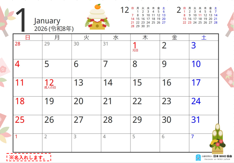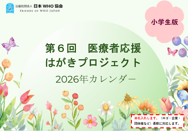 日本 WHO 協会では、「医療者応援はがきプロジェクト 2025」の一環として、応募作品を掲載した 2026年版『医療者応援はがきプロジェクト カレンダー』 (2026年 1月~2026年12月) を制作しました。 (小学生版、中学生 ・ 特別支援学校生徒版、小学生 ・ 中学生 ・ 特別支援学校生版 の 3 種類)